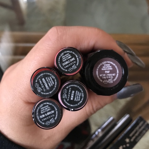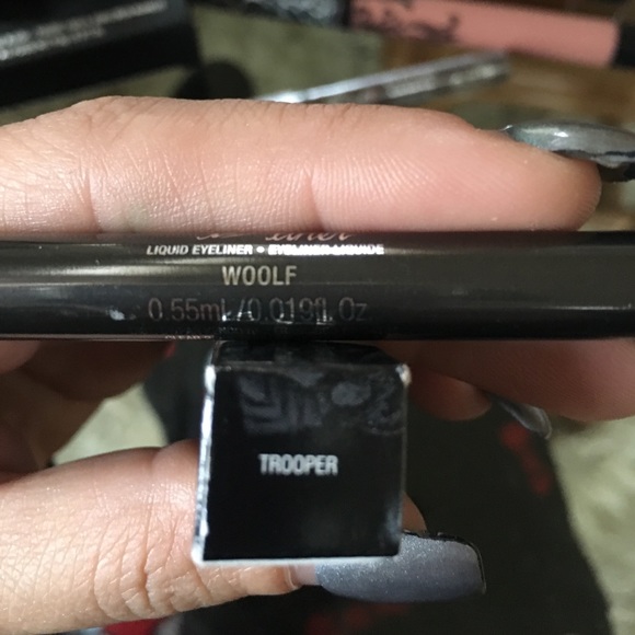 Everything lightly SWATCHED. TROOPER IS BNIB. Liquid lipsticks in Requim, Bow n Arrow, Double Dare, and Nosferatu, studded kiss in Piaf, ink liner in Woolf, and shade and light blush in Sid and Nancy.