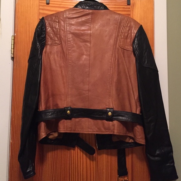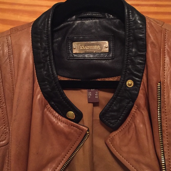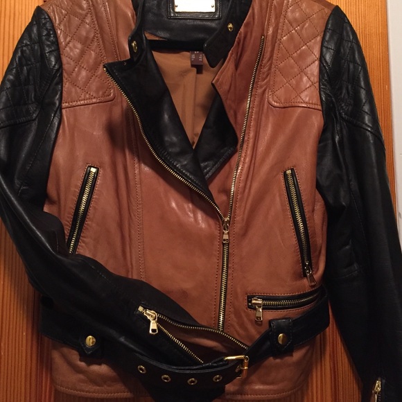 Two tone (black/cognac) leather jacket from Danier. Gold tone zippers & snaps. Zipper front, snap-tab collar. Quilted details on shoulders. Canadian Size Small – UK sz 12, FR sz 40, IT sz 42. No trades and price is firm.
