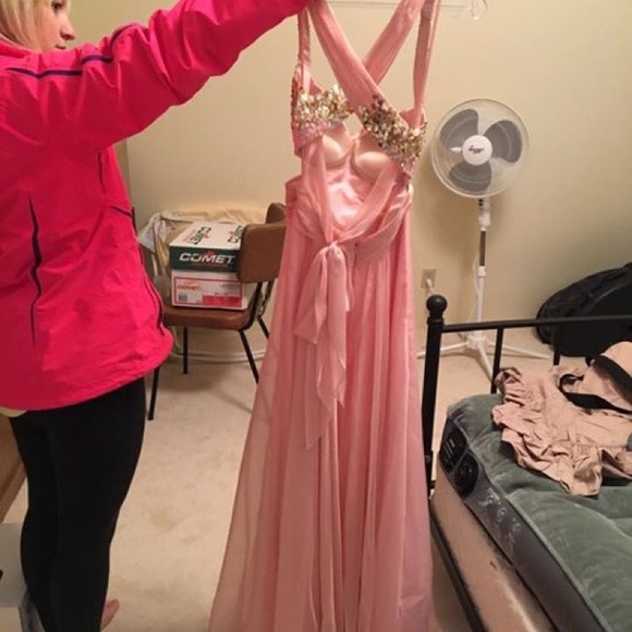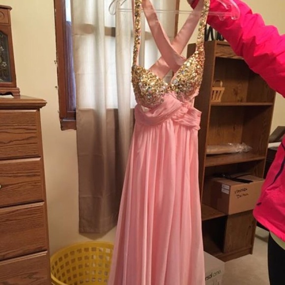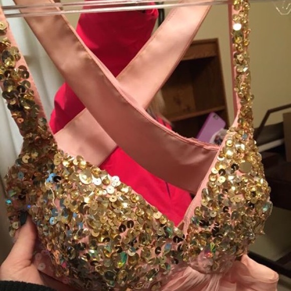 Abstract cut on a light pink and gold dress! Super comfortable! One tear at very bottom from my heel only worn once! Comfortable
