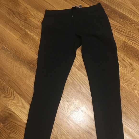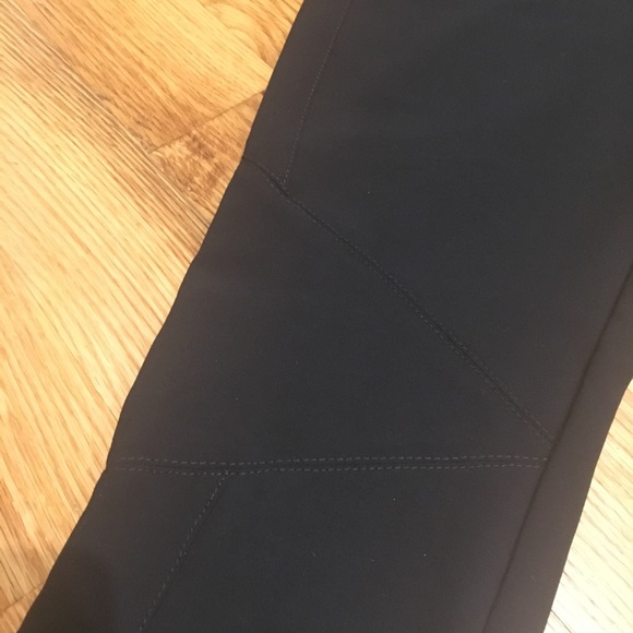 Never worn, tags still on! Beautiful straight-legged black pants with subtle stitching around the knee for a more contemporary look. I’m 5’ 2” and the length was perfect on my short frame. Front zip-up and a snap. No pockets.