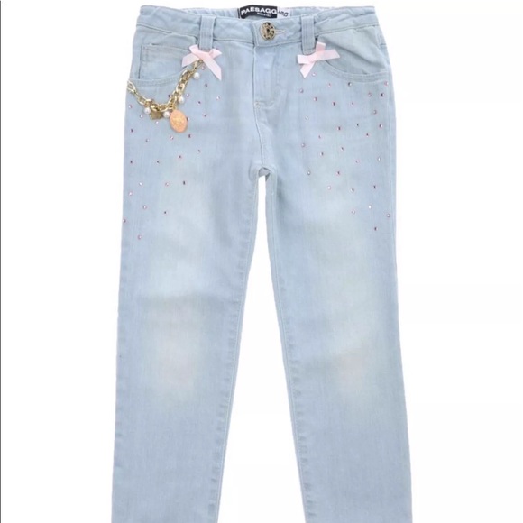 A super soft white cotton top with “BARBIE” on the front. Embellished with jewels and rhinestones and in large pink lettering. The sleeves are also trimmed in pink ribbon and rows of jewels. Comes with a pair of matching denim jeans which are also embellished with pink rhinestones, bowsand an adorable chain with hanging charms, pearls etc… PAESAGGINO is a boutique brand from Italy and their clothes are spectacular!!! The perfect back to school outfit. BNWT. Size 6.