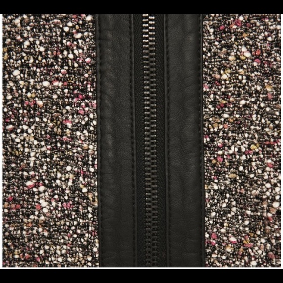 Material Content: 66% Cotton, 27% Viscose, 6% Polyamide, 1% Polyester; Trim: Lamb skinColor: Taupe and blackDescription: Brown Lory Boucle Leathertrim Jacket This black, white, pink and yellow boucle knit jacket is collarless, has round-neck and long sleeves with black leather shoulder panels. The box-cut jacket has a black leather trimmed centre front zip fastening, zipped side pockets and zipped cuffs. Dry clean. Country of origin: China.Condition: Excellent