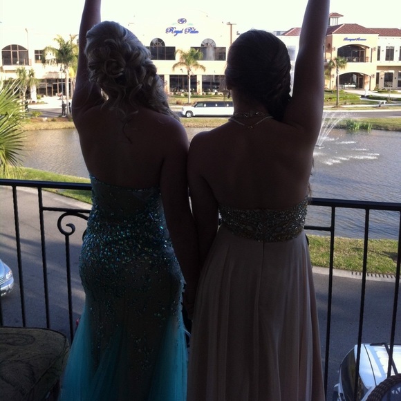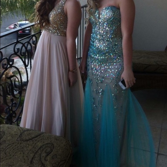Turquoiseish blue Mermaid style jeweled prom dress made by 2 Cute. Size 4. Worn once. Great condition